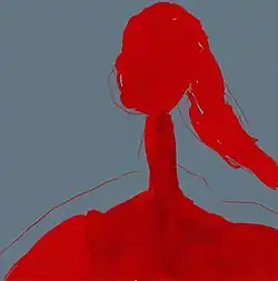 On July 25, 2020, West tweeted out an album cover,[133] showing an infrared scheme of orange and red mirroring the shape of the people, sun, and moon in the sky, backed by green mountains alongside purple and white clouds designed by Pierre-Louis Auvray.[92] In the lead up to the first Donda listening event on July 22, 2021, a possible replacement cover was used as the promo artwork. The cover was an adaptation of a Louise Bourgeois gouache painting that had been created in 2007, the same year as Donda West's death, and included in Bourgeois' series Les têtes bleues et les femmes rouges (2015).[134][135] In the painting, a woman is shown in monochromatic red and a matching ponytail flows behind her, while a fertility idol is also partially present.[134][135] After Kanye West posted numerous potential covers, a plain black square was ultimately used as the artwork for the album.[136]