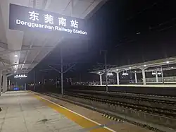 Dongguan South railway station (Chinese: 东莞南站) is a station in Tangxia, Dongguan City, Guangdong Province, China. It is one of the stations on the Beijing-Hong Kong High-Speed Railway between Huizhou North railway station in Huizhou and Guangmingcheng railway station in Shenzhen City.
