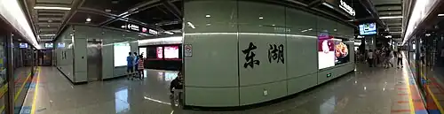 Donghu Station (simplified Chinese: 东湖站; traditional Chinese: 東湖站; pinyin: Dōnghú Zhàn; Cantonese Yale: Dūngwù Jaahm; lit. 'East Lake station') is an interchange station between Line 6 and Line 10 of the Guangzhou Metro. It is located underground within Dongshan Lake Park in Guangzhou's Yuexiu District. The Line 6 station started operations on 28 December 2013.[1] The Line 10 station started operations on 29 June 2025, thus becoming an interchange station.[2]