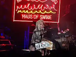 In November 2013, Gaga hosted a two-day event called ArtRave, which served as the launch party of Artpop, and performed "Dope" on the piano.[56] Before the performance, she gave a speech about her own experiences with drugs and alcohol, and how she came over addiction.[57] Days later, Gaga appeared on The Howard Stern Show and performed another piano-only version of the song.[58] On December 6, 2013, Gaga performed both "Dope" and an acoustic rendition of Artpop's second single "Do What U Want" on Alan Carr: Chatty Man.[59] In March 2014, she performed the song at South by Southwest (SXSW), while sporting fake blond dreadlocks.[60]