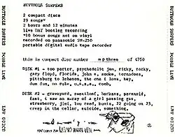 ![]() Back cover of the CD edition, indicating it's a numbered edition DAT bootleg recording, and with the advice "VERY LOUD IT PLAY", as noted at the Rolling Stone Album Guide.[2] |