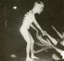 ![]() Kathleen Lynch, naked dancer, greeting Butthole Surfers fans on the front cover,[1] slightly deformed with a bigger head and an alien-like spine compared to the original photo. | ||||