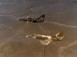 In RNZAF service, the single-seat Skyhawks bore tail codes ranging from NZ6201 to NZ6210 while the two-seaters had tail codes NZ6251 to NZ6254.[21] They originally carried a brown-green camouflage scheme but towards the end of 1984, the RNZAF adopted a grey-green pattern for its Skyhawks. The new scheme was quickly found to be very effective when operating over land and, because of there was no distinction between the upper and lower surfaces, during aerial engagements it was difficult for opponents to quickly detect whether the aircraft was turning towards or away from them.[22][23] In 1997, an all-dark green scheme, with the roundel insignia and other markings represented in matt black, was adopted for the Skyhawks.[24]