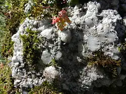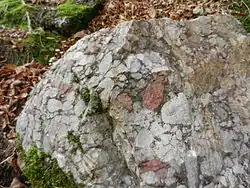 The Dovžan Gorge was protected as a natural monument in 1988 due to its status as a unique site of plant and animal fossils in rocks from the Paleozoic.[4][5] Numerous species of brachiopods and the foraminifer Schwagerina carniolica were first found and described in the gorge. The picturesque gorge was formed by the Tržič Bistrica River cutting through various conglomerates, limestones, sandstones, and clays. The gorge contains the largest series of barrier waterfalls in Slovenia, formed from quartz conglomerate. Pine Cliff (Slovene: Borova peč), which is overgrown with a Scots pine forest, is also composed of quartz conglomerate.