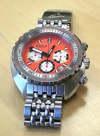 In the late 1960s Doxa planned to produce a watch to be used while diving. Tests indicated that an orange face was more visible in murky water.[3] Doxa also consulted with divers, including Jacques Cousteau, then chairman of "U.S. Divers," and Claude Wesly. A staff of engineers and professional divers was assembled to create a watch with the required features, the Sub300t. Between 1968 and 1979 the model was purchased by the Swiss Armed Forces for a newly established unit of combat divers.[4]
