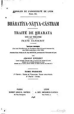 Poetics is the earliest surviving Western work of dramatic theory. The earliest non-Western dramaturgic work is probably the Sanskrit work Nātya Shāstra (The Art of Theatre), written around 500 BCE to 500 CE. It is thought to have been written by a number of people, the core of which was compiled by the dramatist Bharata.[14] This work describes the elements, forms, and narrative elements of the ten major types of ancient Indian drama.[15] One of the concepts expressed in the Nāṭya Shāstra is the idea of bhaavas, or the emotions expressed by the actors. [16][17] There are 33 bhaavas mentioned, including love, horror, excitement, etc. [17] These are intended to evoke rasa for the audience. [17] Rasa is hard to define in English, since there is not an English equivalent for this word, but it represents the emotions felt by the audience, which is separate from emotions experienced through real life.[18] The term rasa first appeared in the Nāṭya Shāstra. [18]