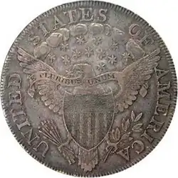 Coinage began on the first United States silver dollar, known as the Flowing Hair dollar, in 1794 following the construction and staffing of the Philadelphia Mint. The Coinage Act of 1792 called for the silver coinage to be struck in an alloy consisting of 89.2% silver and 10.8% copper.[1] However, Mint officials were reluctant to strike coins with the unusual fineness, so it was decided to strike them in an unauthorized alloy of 90% silver instead.[2] This caused depositors of silver to lose money when their metal was coined.[2] During the second year of production of the Flowing Hair dollar, it was decided that the denomination would be redesigned.[3] It is unknown what prompted this change or who suggested it, though numismatic historian R.W. Julian speculates that Henry William de Saussure, who was named Director of the Mint on July 9, 1795, may have suggested it, as he had stated a redesign of the American coinage as one of his goals before taking office.[4] It is also possible that the Flowing Hair design was discontinued owing to much public disapproval.[3]