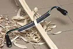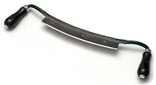 A drawknife (drawing knife, draw shave, shaving knife)[1] is a traditional woodworking hand tool used to shape wood by removing shavings. It consists of a blade with a handle at each end. The blade is much longer (along the cutting edge) than it is deep (from cutting edge to back edge). It is pulled or "drawn" (hence the name) toward the user.