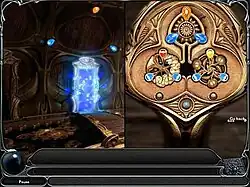 In addition to give players time to explore every aspect of the scenes, KatGames added a device called the Nexus gateway, a series of gateways that allow players to travel to different interconnected locations after they figure out how to unlock them; this makes the game non-linear and allows players to move freely throughout the game world.[10] Instead of being confined to a linear path, The Chosen Child opens the door for wider exploration, creating the epic feel the series needed to move to the next level. As a result, now players can travel back and forth all the scenes by pulling levers to rotate a massive set of gears and portals in the Nexus gateway, yet this unique feature only appeared in The Chosen Child.[9] For the second time in the Dream Chronicles series, players can enjoy the experiences of solving maze puzzles. The Chosen Child contains two underwater labyrinths, one in the 19th scene and the other one in the 23rd scene, but they are criticized for their highly difficult level preventing some players from completing the whole game.[6] The game has a hint system, in the form of crystal ball. It rarely tells the exact solution, but instead gives players slight hints. Like in the two previous games of the series, the screen sparkles at times hinting the place where players are to pick up or apply something, but that rarely happens. If players get stuck, they have to keep looking until finding the right item.[6]