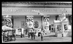 Many of the park's shows were replaced for the 1906 season, and park officials also rebuilt the pier.[42] The new attractions for that season included a reenactment of the 1906 San Francisco earthquake's aftermath; a Moqui Indian village; a rebuilt Creation show;[42][43] and the Touring New York car show.[44] The park opened for the 1906 season on May 20,[42] and it began hosting vaudeville shows for the first time that June.[45] Dreamland's third season ended on September 24, 1906.[46] Prior to the 1907 season, concessionaire William Ellis introduced an attraction called the Orient, anchored by a theater that presented several shows.[47][48] Park officials also built a new administration building and installed other shows.[49] Park officials gave $50 to the first guest of the season on May 18, 1907,[49][50] and the park operated through September 21 of that year.[51] At this point, the park hosted several shows that were based on themes of morality,[52][53] such as "The End of the World" and the "Feast of Beshazzar and the Destruction of Babylon".[48][54]