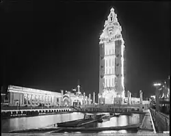 Construction of the park itself began in December 1903.[18][22] General contractor Edward Johnson Company employed about 2,000 workers,[15] who were employed in three shifts of eight hours each.[8][22] The park was known as Dreamland by January 1904.[25] Reynolds, wishing to surpass Luna Park by every metric, reportedly spent $3.5 million on Dreamland.[8][26] Dreamland had one million lights, compared to 250,000 lights at Luna Park; even Dreamland's firefighting show was more elaborate than that at Luna Park.[27] Dreamland also planned to differentiate itself from Luna Park by adding novel attractions, as well as operating a private beach and bath house (something that Luna Park lacked because of its inland location).[8] Samuel W. Gumpertz was among those who helped develop the park.[28]