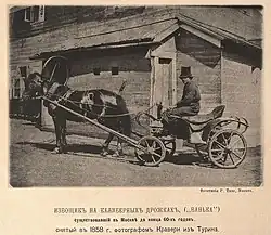 A droshky or drosky (Russian: дрожки (plural); Polish: dorożka (singular); German: Droschke (singular); Estonian: troska (singular)) is a term used for a four-wheeled open carriage used especially in Russia. The vehicle has a long bench on which the driver or passengers sit as if on a saddle, either astride or sideways.[1][2] From droga, the pole that connects the front and rear axles.