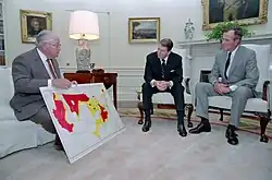 President of the United States Ronald Reagan and Vice President Bush discuss the drought with Secretary of Agriculture Lyng