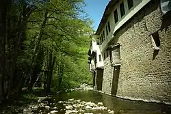 The valley widens between the villages of Durcha and Tsareva Livada, and then enters a deep gorge in the eastern part of the Strazhata Plateau, where the Dryanovo Monastery is situated. After exiting the gorge the river turns northeast. Downstream of the town of Dryanovo its valley widens again and the Dryanovska reka flows into the Belitsa at an altitude of 144 m west of the town of Debelets.[1][2]