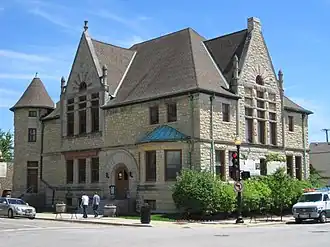 The building is found at the southeast corner of Wesley and Main Streets in Wheaton. It stands two stories tall and was built with coursed limestone and Bedford stone trimmings in the Richardsonian Romanesque style. The style is characterized by rough-hewn stone blocks, emphasized horizontal lines, wide rounded arches, and intricate ornamentation. The work is nearly identical to a library that Frost designed in Morgan Park, Chicago the previous year. Each facade has a tall stone gable with pinnacles on either side near the base. Gable eaves have dentil moldings carved into a leaf motif. Each gable has an arched window. The north gable is capped with a decorative urn. The north facade features a turreted stair tower on the east side. It also has a double doorway, the main entrance, and a bay window on the west side of the first floor. The entrance is arched with a Bedford stone egg-and-dart voussoir. An inner arch is ornamented with a leaf design. The south facade has a bay window that looks out onto a small courtyard.