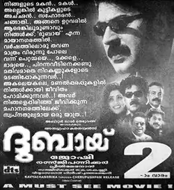 Dubai is a 2001 Indian Malayalam-language political action film directed by Joshiy starring Mammootty, N. F. Varghese, Biju Menon and Nirmal Pandey. Anjala Zaveri, Vijayakumar, Cochin Haneefa, Janardhanan, Nedumudi Venu and Preetha Vijayakumar play supporting roles. The script for the film was written by Renji Panicker. It is one of the Malayalam movies with a long duration. It received negative reviews from the critics and was a failure at the box office.[2]