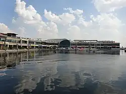 The first phase of construction comprised over 14,500 m2 (156,077 sq ft) of façade roofs designed and built by Austrian specialist contractor Waagner Biro,[4] mainly over the crescent mall, festival square, oval court and knuckle. Within the development, Waagner Biro also constructed seven pavilions.[4] When completed, the development will cover a total area of 526 hectares (1,300 acres).[5]