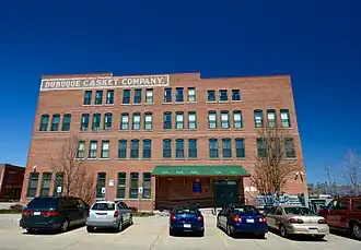 The Dubuque Casket Company is a historic building located in Dubuque, Iowa, United States. The city was a leading national market in the production of caskets towards the end of the 19th century.[2] This location had been the site of a casket manufacturing plant from 1877 to 1987. The Dubuque Furniture and Burial Case Company was the first firm in Dubuque and the first to locate here. The building was largely destroyed by fire in 1883 and the company was forced out of business. The Dubuque Casket Company was incorporated in 1893 and acquired this property. They started construction of the first part of this building the same year. The four-story brick Neoclassical building was one of the largest manufacturing facilities in Dubuque.[2] The machine and equipment room was located on the first floor, they manufactured fine cloth covered caskets on the second floor, they manufactured undertaker's dry goods on the third floor, and the fourth floor was used for storage. The first addition, now known as the center section was begun in 1903, and another expansion that also unified the main facade was begun in 1911. Two other Dubuque casket manufacturers, Iowa Coffin Company and the Hawkeye Casket Company, were out of business by 1924.