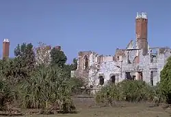 Dungeness on Cumberland Island, Georgia, is a ruined mansion that is part of a historic district that was the home of several families significant in American history. The mansion was named after a nearby sandy spit at the southern end of the island, first recorded in a land grant petition in 1765 and almost certainly named after the Dungeness headland, on the south coast of England.[2]: 54 The first Dungeness house was the legacy of Revolutionary War hero Nathanael Greene, who had acquired 11,000 acres (45 km2) of island land in 1783 in exchange for a bad debt. In 1800, his widow Catharine Miller (by then remarried) built a four-story tabby mansion over a Timucuan shell mound.[2]: 98–101 During the War of 1812 the island was occupied by the British, who used the house as a headquarters.