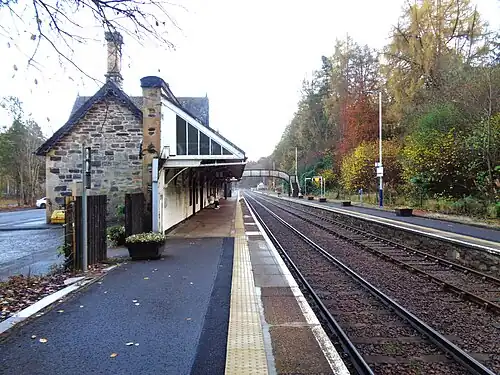 Dunkeld & Birnam railway station (usually referred to as just as Dunkeld) serves the town of Dunkeld and village of Birnam in Perth and Kinross, Scotland. It is located on the Highland Main Line, 15 miles 31 chains (24.8 km) north of Perth and is the first stop on the line north of there, before Pitlochry.[4] Most services are operated by ScotRail, who also manage the station. LNER and Caledonian Sleeper also call some services here.