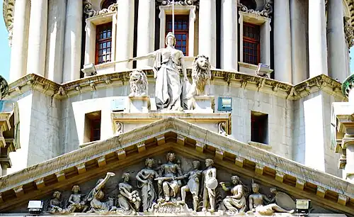 The building, which features an Edwardian neobaroque style, is almost an exact replica of Belfast City Hall in Northern Ireland.[1][2] The façades are decorated by allegorical statues depicting the arts, music, literature, commerce and industry.[2]