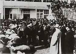 At Epsom he started at 20/1 against thirty opponents, one of the largest fields ever assembled for the race. A possible explanation for the size of the field was that an unusually large numbers of "forlorn hopes" were starting in the race in order to collect money on sweepstakes tickets.[4] A year after the "suffragette Derby" of 1913 the race was marked by another incident in which a campaigner for women's suffrage, named as Ada Rice was arrested after firing a starting pistol at a policeman.[5] The start of the race was delayed for more than twenty minutes as the starter struggled to control the runners leading the favourite, Kennymore, the winner of the 2000 Guineas to become increasingly fractious, lashing out with his hooves and attempting to attack other horses.[1] Once the field was underway Durbar, ridden by the French-based American Matt McGee,[6] was always prominent, led soon after halfway, and won easily by three lengths.[7] He was followed home by two other outsiders, Hapsburg and Peter the Hermit[8] in a result which left the huge crowd stunned into silence. Although the colt had been bred and trained in France his owner's nationality meant that his win was greeted as an American victory in the United States.[9]