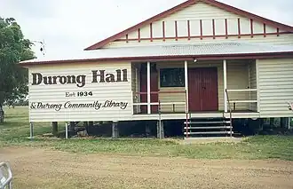 The Durong Public Hall opened on Saturday 14 April 1934. It replaced a smaller building one quarter of the size.[8]