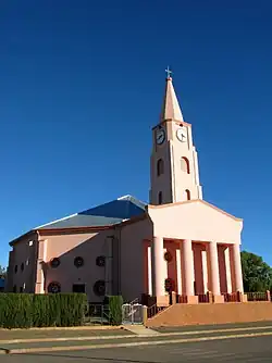 The Dutch Reformed Church in Hofmeyr is a congregation of the Dutch Reformed Church in the north of the area of the NG Church in the Eastern Cape, which had only 138 professing members in 2012 and about 110 at the end of 2015. The center of gravity of the congregation is the town of Hofmeyr on the R390, located 65 km from Cradock and 46 km from Steynsburg.[1] The church is painted in a coral pastel color, which some perceive as pink, due to a combination of factors including the presence of other buildings in pastel colors in the town at the time of its first painting, and an artist's advice to match the color of the local red lime scale and coral sunsets.[2]