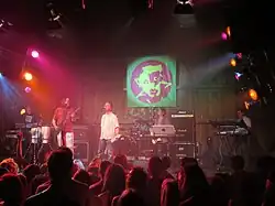 ![]() Dzeltenie Pastnieki live in 2006. From left: Viesturs Slava, Ilgvars Rišķis, Ingus Baušķenieks. | |