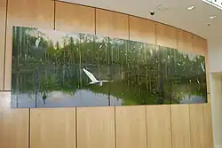 Francis Pavy's “Louisiana Wetlands”, located in the Bert S. Turner Family Lobby of The Auditorium, is a harmony of images symbolic of the state's bayous, marshes and swamps. Featuring a wide array of colors and stenciled on elements, the five-foot tall, 20-foot wide piece was completed to commemorate the 200th anniversary of Louisiana's statehood.