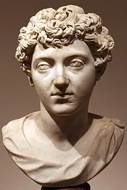 Lucilla and Verus (III) had two children: a son, Marcus, born on 26 April 121, and Annia Cornificia Faustina, probably born in 122 or 123.[18] Verus (III) probably died in 124, during his praetorship, when Marcus was only three years old.[19][notes 1] Though he can hardly have known him, Marcus wrote in his Meditations that he had learned "modesty and manliness" from his memories of his father and from the man's posthumous reputation.[21] Lucilla did not remarry.[19]