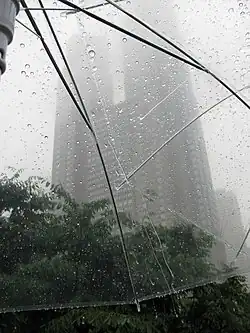 ![]() Plum rain falling on two clear umbrellas, looking up toward the Tokyo Metropolitan Government Building, in June 2009 | |||||||||||||||||||||||||