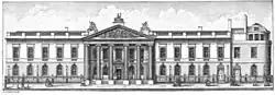 The frontage as Jacobsen originally designed it is known from engravings, and from a detailed wash drawing by Samuel Wale of c. 1760.[13] Its five bays were three storeys high, with an attic storey disguised behind the cornice balustrade. A giant order of Doric pilasters under an academically correct frieze of triglyphs demonstrated the East India Company's soundness[14] and seriousness of purpose: the Directors' "aim was resolutely down to earth – to inspire confidence and impress the shareholders."[15] The structure was unexpectedly deep, affording large meeting rooms and Directors' offices, as well as a hall, a courtyard and a garden, all of which could serve for receptions. The Directors' Court Room featured a marble chimneypiece with bearded term figures that supported the mantel shelf and an overmantel bas-relief panel, Britannia Receiving the Riches of the East, under a pediment, the work of Michael Rysbrack (1728–30).[16][17] In the Directors' Court Room, six canvases by George Lambert appropriately illustrated the East India Company's main "factories": St. Helena, Cape Town, Fort William, Calcutta, Bombay, Madras and Tellicherry; East Indiamen in the foregrounds were painted by the marine artist Samuel Scott.[18] Carvings in the interiors were carried out by John Boson.