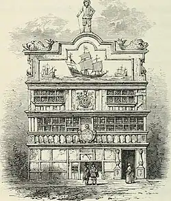 In 1648, therefore, it took a lease on the adjoining property, Craven House, a late Elizabethan mansion built by Sir Robert Lee, Lord Mayor of London, and named after one of his successors, Sir William Craven, who had occupied it at a later date.[4][5] By 1661 the building was known as East India House. In that year, the frontage was given an ornamental wooden superstructure decorated with paintings of some of the Company's ships, and surmounted by a wooden sculpture of a seaman.[6] Over the years following, various improvements and extensions were made to the premises; and in 1710 a contract was signed for the company to buy the property from Lord Craven (although the purchase was not in fact completed until 1733).[7] Further extensions were made, but by the mid-1720s the mansion was considered to be in such poor condition, and the company's need for additional space so pressing, as to justify complete rebuilding.[8] To allow this to take place, the Company moved into temporary premises in Fenchurch Street early in 1726.[9]