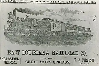 The East Louisiana Railroad (officially the East Louisiana Railroad Company), chartered in 1887, was a railroad in Louisiana and Mississippi, United States. It was formed to connect Pearl River, Louisiana, to Covington, Louisiana, and Lake Pontchartrain.[1]