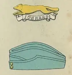 The East Riding of Yorkshire Imperial Yeomanry wore serge khaki uniforms in drill order, with staff cap and brown equipment. The walking out dress comprised a Slouch hat and a serge tunic with blue plastron front, shoulder straps and waistbelt.[12] After it became a lancer unit, it adopted full dress uniform with a Chapka lance cap, the upper part covered in light blue cloth, and a tunic of maroon cloth (an unusual colour for the British Army) with light blue plastron, shoulder straps and cuffs. The unit adopted as its badge a running fox and the motto 'Forrard' in recognition of its foxhunting heritage.[22][23][75]