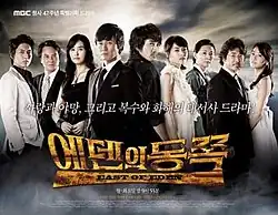 East of Eden (Korean: 에덴의 동쪽; RR: Edenui dongjjok) is a 2008 South Korean television series, starring Song Seung-heon,[1] Yeon Jung-hoon, Lee Da-hae, Han Ji-hye,[2] Park Hae-jin and Lee Yeon-hee. It was produced by Chorokbaem Media as a 47th Anniversary Special Project Drama for MBC, on which it aired from August 25, 2008, to March 10, 2009, on Mondays and Tuesdays at 21:55 for 56 episodes. The ₩25 billion drama tells the story of the brothers Dong-chul (Song) and Dong-wook (Yeon). Their fates diverge after the murder of their coal miner father, with one joining the mob and the other becoming a successful lawyer.[3][4][5]