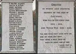 Eastwood coal, metal castings, rope, wire and agricultural products made valuable contributions to Britain's war effort during the two world wars. In the Second World War, Eastwood supplied soldiers to the Sherwood Foresters Regiment. A memorial on Nottingham Road commemorates Eastwood residents who gave their lives in both world wars.[7]