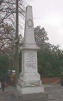 A war memorial was unveiled in 1921, inscribed "to the men of Eastwood, who fell in the Great War 1914–1918." Later, World War II dedications were added, and it was moved to its present location at Plumptre Way. It is in the shape of an obelisk, made of Italian marble with a base of Whatstandwell stone.[23] The Library, opened in 1975, includes an extensive collection of books by and about D H Lawrence. Also on view is Lawrence's desk, and the headstone from his grave in Vence, France.[20]