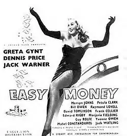 Easy Money is a 1948 British satirical film directed by Bernard Knowles and starring Greta Gynt, Dennis Price and Jack Warner.[4] It was written by Muriel and Sydney Box, based on the 1948 play of the same title by Arnold Ridley. It was released by Gainsborough Pictures.