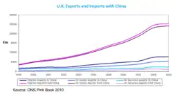 Apart from coal, iron, tin and kaolin most raw materials had to be imported so that, in the 1830s, the main imports were (in order): raw cotton (from the American South), sugar (from the West Indies), wool, silk, tea (from China), timber (from Canada), wine, flax, hides and tallow.[76] By 1900, Britain's global share had soared to 22.8% of total imports. By 1922, its global share was 14.9% of total exports and 28.8% of manufactured exports.[77]
