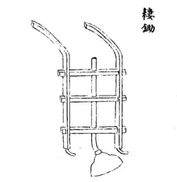 While there was already a great diversity in agricultural implements of the tread plow (tali 踏犁) because of lacking oxen, of lever-knife (zhadao 鍘刀) and the northeastern-style plow (tang 耥), the use of water power to move millstones, grinding stones and hammers and to move water from canals and rivers to irrigation ditches by a chained-buckets mechanism (fanche 翻車) became more and more usual, especially with large land owners. Until then, water was hoisted by a mechanism where large step-powered wheels (tache 踏車) moved chained buckets with water from the river to a ditch. As an inplement to pluck out rice seedlings peasants made use of the "seedling horse" (yangma 秧馬), planting and fertilizing was the task of a machine called "dung-drill" (fenlou 糞耬). In northern China, a "drill-tiller" (louchu 耬耡) was in use, while in the lower Yangtze region, a "plow-weeder" (tangyun 耥耘) became widespread at the end of Southern Song. For harvesting, a pushing scythe (tuilian 推鐮) with two wheels was invented.[10]