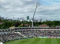 The pavilion end on the south side of the ground was completely redeveloped between 2010 and 2011 at a cost of £32 million, partly paid for from a £20 million loan from Birmingham City Council, bringing the ground's capacity up to 25,000.[14] Demolition of the pavilion – parts of which dated back to the 1890s – and the Leslie Deakins, R. V. Ryder and William Ansell Stands took place in January 2010, with construction of the new South and West Stands starting in April 2010 and reaching completion 66 weeks later.[15] 5 permanent floodlight pylons were erected around the ground at the same time, allowing up to 15 days of day-night cricket annually.[15] The new development was officially opened by the Duke of Edinburgh on 25 July 2011.[16] The first test match to be played at the redeveloped venue was the third Test vs India on 10 August 2011, which saw England reach the number 1 position in the ICC Test Championship for the first time with victory by an innings and 242 runs on the fourth day of the match.[17]