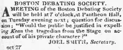 In 1817, a local playwright named Charles Bucke submitted his play The Italians, or; The Fatal Accusation to Drury Lane, for which Kean was to play the lead. The play was well received by both council and actors until Kean seemed to have a change of heart and began to make several offhand remarks that his part was not big enough for him. Then, after a performance in February 1819 where Kean went out of his way to botch the opening night of Switzerland, a play by historical novelist Jane Porter, for whom Kean had had a personal dislike, Bucke pulled the play out of contempt for Kean's conduct.[6] After much cajoling by the theater staff to perform the play, Mr. Bucke then later had it republished with a preface concerning the incident, including excerpts from correspondence between the involved parties, which was later challenged in two books, The Assailant Assailed and A Defense of Edmund Kean, Esq. The result was loss of face on both sides, and the play being performed anyway on 3 April 1819 to a disastrous reception, thanks to the controversy already surrounding the play and Kean's previous conduct.[7]