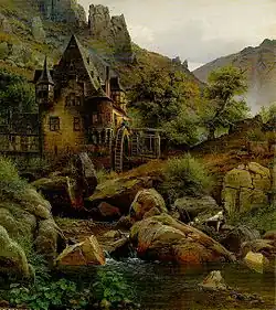 From 1829 to 1836, he attended the Kunstakademie Düsseldorf and studied with the landscape painter, Johann Wilhelm Schirmer from 1832 to 1833.[1] His first landscapes depicted the regions of Hunsrück and Eifel and received excellent marks. In 1836, he and several other students left the Kunstakademie, due to conflicts with its conservative director, Friedrich Wilhelm Schadow.
