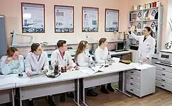 Children of elementary classes are normally separated from other classes within their own floor of a school building. They are taught, ideally, by a single teacher through all four elementary years (except for physical training and, if available, foreign languages); 98.5% of elementary school teachers are women.[37] Their number decreased from 349,000 in 1999 to 317,000 in 2005.[38] Starting from the fifth year, each academic subject is taught by a dedicated subject teacher (80.4% women in 2004, an increase from 75.4% in 1991).[39] Pupil-to-teacher ratio (11:1) is on par with developed European countries.[40] Teachers' average monthly salaries in 2008 range from 6,200 roubles (200 US dollars) in Mordovia[41] to 21,000 roubles (700 US dollars) in Moscow.[42]