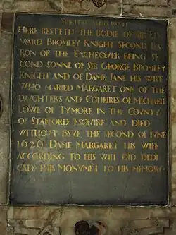 - Here resteth the Bodie of Sir Edward Bromley, Knight, second Baron of Exchequer, being second sonne of Sir George Bromley, Knight, and of Dame Jane his wife. Who married Margaret one of the daughters and coheirs of Michael Lowe, of Tymore, in the County of Stafford, Esquire and died without issue, the second of June 1626. Dame Margaret his wife according to his will did dedicate this monument to his memory.[5]