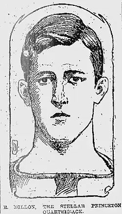 - ^ "Eddie Dillon". Trenton Evening Times. December 2, 1908. ("Eddie Dillon, one of the most famous of Princeton's long list of famous athletes who narrowly missed being the All-American quarterback every season since he first made the Princeton 'Varsity, will wind up his college athletic career this summer by holding down second base for the Princeton baseball nine. Dillon is deservedly one of the most popular men who ever went to the Tiger College. He is a gentlemanly player and excels in anything he attempts. Condition alone prevented him from being selected this season as the All-American football quarterback. He was out of the game most of the season with injuries, and when he was able to play he was not qualified to give his best to the eleven because of lack of practice. He entered Princeton from Exeter, where he was one of the brightest preparatory athletic stars. Recently the announcement of his marriage was somewhat of a bombshell in college circles.")