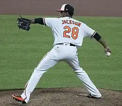 On April 5, 2017, Jackson signed a minor-league contract with the Orioles. He was called up to the Orioles from AAA Norfolk on June 7, 2017.[38]He pitched in 3 games for the Orioles for a total of 5 innings, giving up 11 hits and 7 runs.[39]Jackson was designated for assignment on June 11 and elected free agency two days later.[40]
