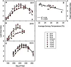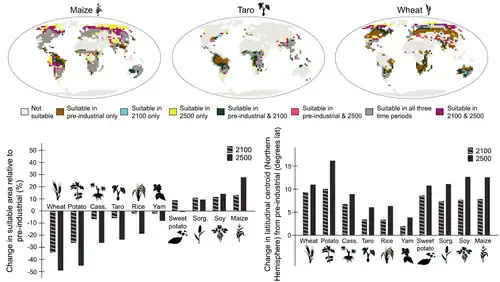 - ^ Zhao, Chuang; Liu, Bing; Piao, Shilong; Wang, Xuhui; Lobell, David B.; Huang, Yao; et al. (15 August 2017). "Temperature increase reduces global yields of major crops in four independent estimates". Proceedings of the National Academy of Sciences of the United States of America. 114 (35): 9326–9331. Bibcode:2017PNAS..114.9326Z. doi:10.1073/pnas.1701762114. PMC 5584412. PMID 28811375.